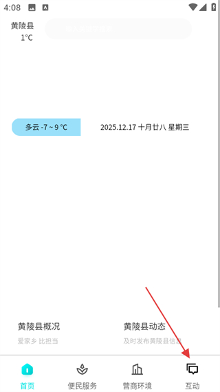 1、在黄陵通首页,点击底部互动选项,进入互动页面。