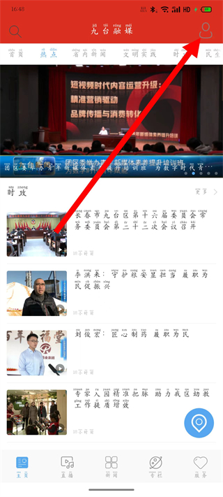 1、打开九台融媒,点击右上角的头像图标,进入个人页面。
