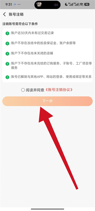 5、在账号注销页面,先确认满足注销条件,勾选协议后,点击下一步。