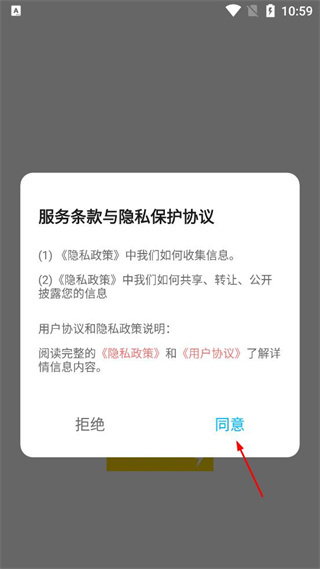 1、打开软件后,看到服务条款与隐私保护协议弹窗,点击同意按钮,进入软件主界面。