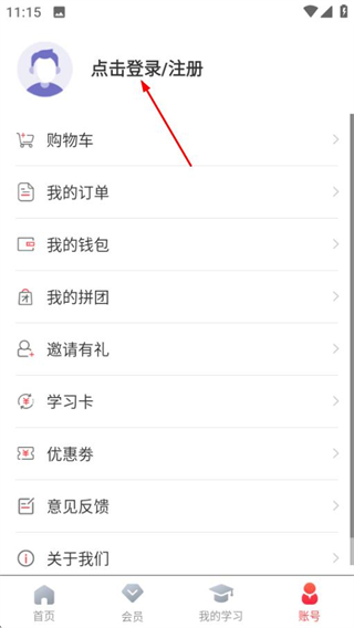 2、在账号页面,点击点击登录注册按钮进入登录界面。