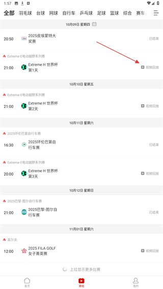 2、在赛程页面中,找到目标赛事条目,点击其右侧的视频回放按钮。