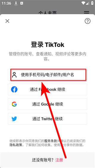 2、在个人主页的注册TikTok界面中,点击下方的登录,进入登录选择页面。