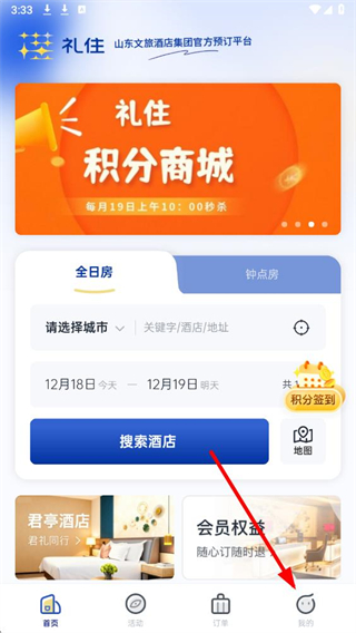 1、打开银座酒店App,点击底部导航栏中的我的。