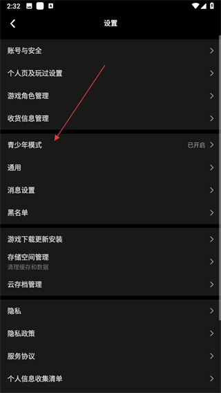 3、打开设置页面之后,在里面找到并点击青少年模式选项。