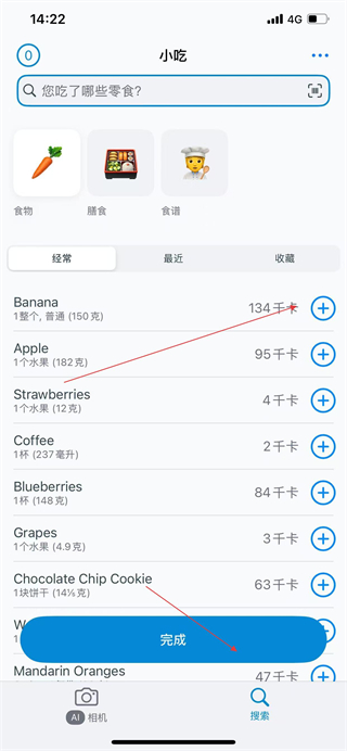 3、在餐食记录页面选择或搜索食用的食物,添加后点击完成,即可记录饮食摄入。