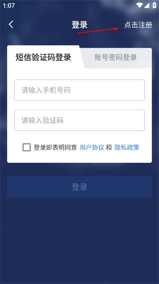 1、进入软件登录页面,找到页面右上角的点击注册按钮,点击该按钮进入注册界面。