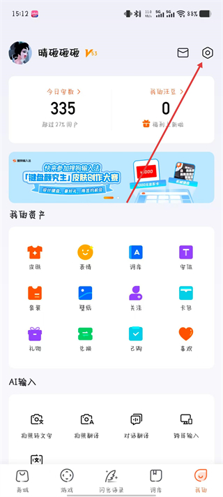 1、在搜狗输入法我的页面,点击右上角设置图标,进入设置页面。