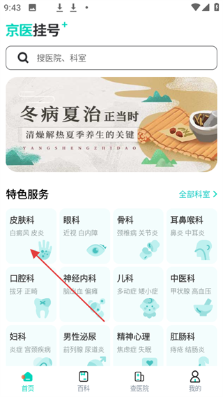 1、打开北京医院挂号通APP,在特色服务板块中,点击想要挂号的科室。