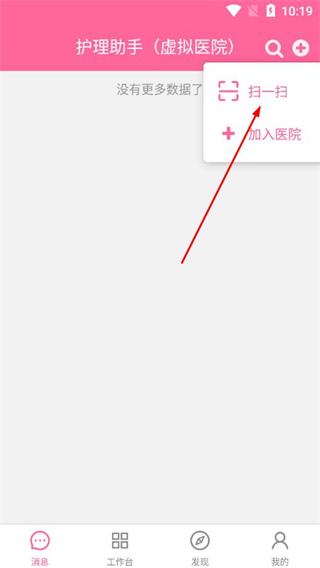 1、打开护理助手应用,在工作台页面点击底部导航栏的消息。