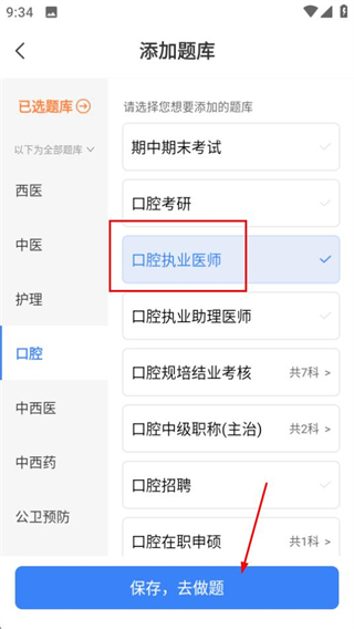 3、在口腔题库列表中选择口腔执业医师后,点击保存按钮完成添加。