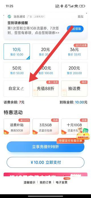 2、在充值页面中,点击自定义选项,进入金额设置界面,以便输入具体的话费充值数额。
