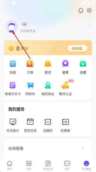 1、在南昊作文首页点击个人中心选项,进入个人中心页面。