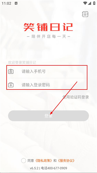 1、在服务协议及隐私政策弹窗中,点击同意,进入笑铺日记的登录页面。