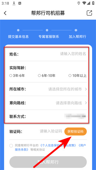 3、在司机招募页面,依次填写基本信息,点击获取验证码。