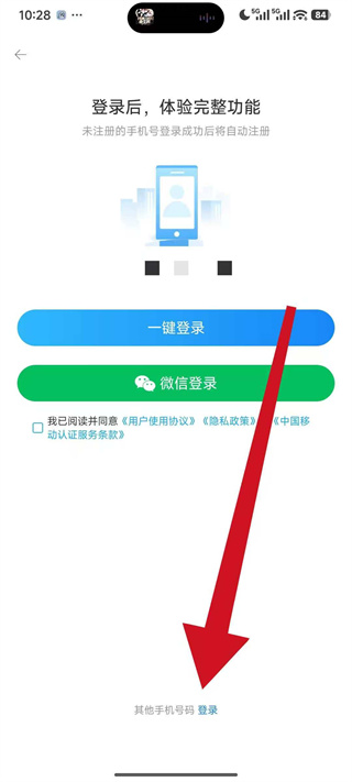 3、在登录页面里,点击其他手机号登录,切换至手机号登录填写页面。