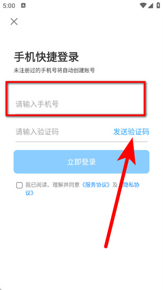 3、在手机快捷登录页面,输入手机号,点击发送验证码。