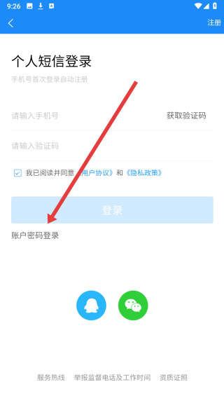 3、在勾选完同意按钮后,可以点击账户密码登录按钮,切换登录方式。