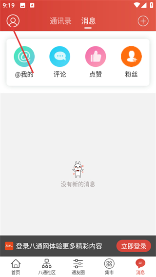 2、在消息页面点击左上角小人头像,进入登录引导页面。