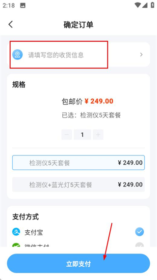 4、在确定订单页面填写收货信息后,点击立即支付完成购买。