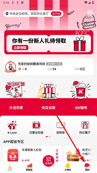 1、打开肯德基APP后,在底部导航栏找到我的选项并点击。