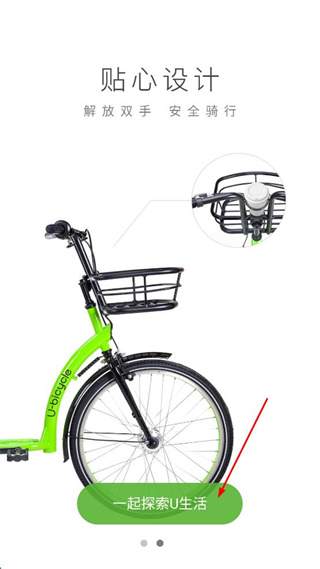 1、打开优拜单车应用,点击页面底部一起探索U生活按钮,进入应用主页面。