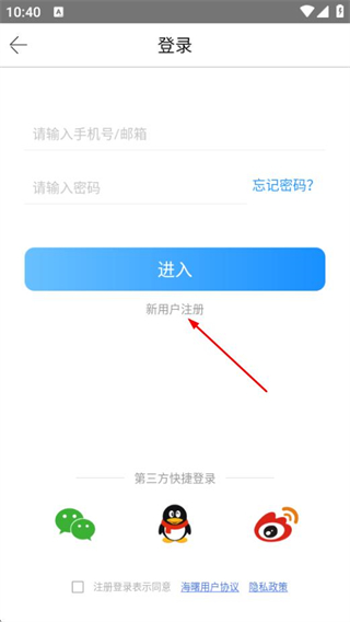 3、在登录页面点击新用户注册选项,进入注册页面。