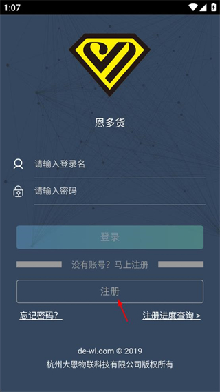 1、进入恩多货软件登录页面,找到注册按钮,点击该按钮进入货主注册界面。