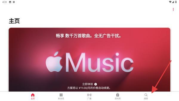 1、打开apple musicAPP进入到首页,点击右下角搜索的功能按钮。