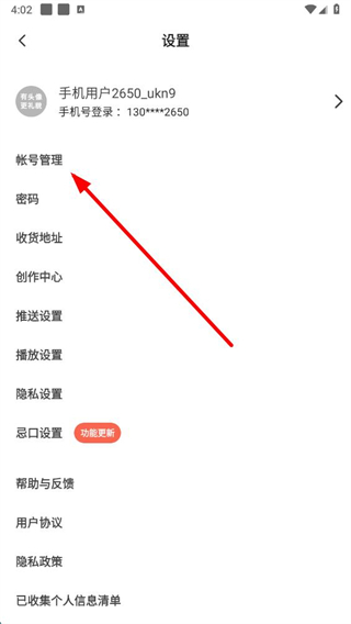 3、在设置页面,点击帐号管理选项,进入帐号管理页面。