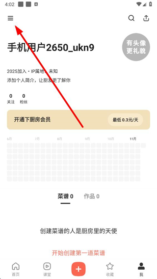 1、打开下厨房app,在我的页面点击左上角三条横线图标,展开功能菜单。