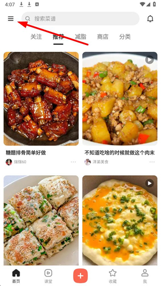 1、在下厨房app首页点击左上角的三条横线菜单图标,展开功能菜单。