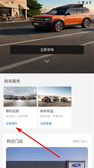 3、进入福特大使页面后,在显示的选项里找到在线客服模块,点击其对应的立即咨询按钮。
