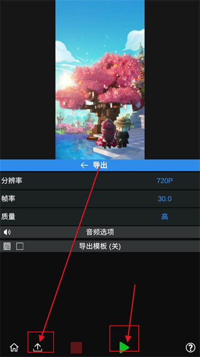 9、最后视频编辑完成,点击左下角的箭头按钮,会出现一个绿色按钮,点击即可导出视频。