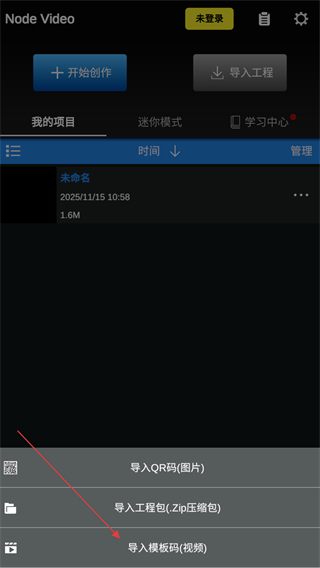 1、打开nodevideo的APP,进入时点击导入工程的按钮。
