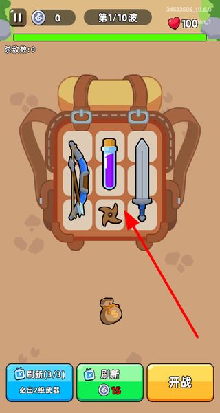 1、进入第1波对战前,将下方出现的武器拖入背包格子,可选择刷新按钮更换武器,配置好后点击开战按钮,即可开启对战。