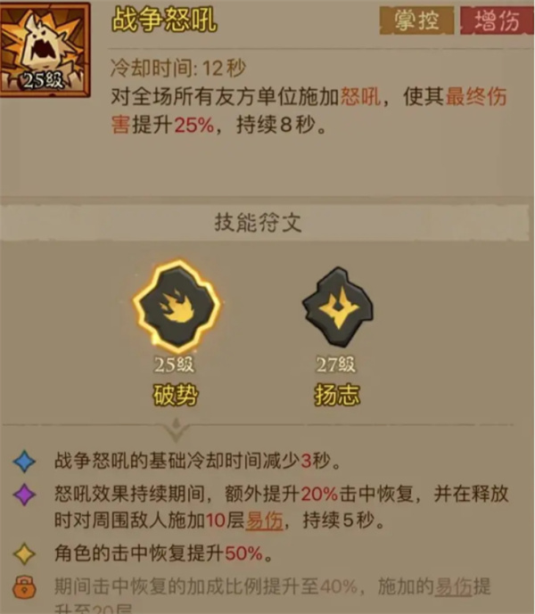 控制机制:践踏·强劲击退敌人并造成1.5秒眩晕,冷却时间12秒;战争怒吼·破势降低敌人25%防御,持续10秒,为后续输出创造条件。