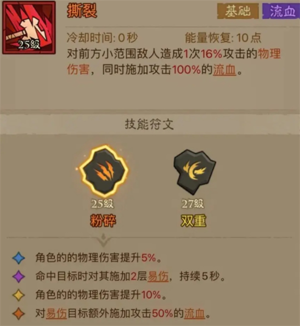 易伤叠加:撕裂·粉碎攻击时有45%几率使敌人进入易伤状态,持续8秒,可叠加3层,每层提升敌人所受伤害15%,是应对高防御敌人的关键。