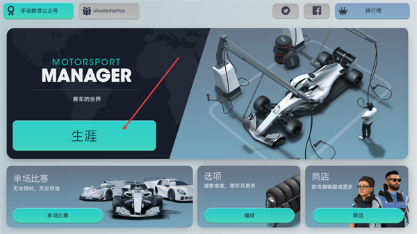 1、在游戏主界面找到标有MOTORSPORTMANAGER的区域,点击生涯按钮即可进入车队经理的生涯模式,开启游戏核心玩法。