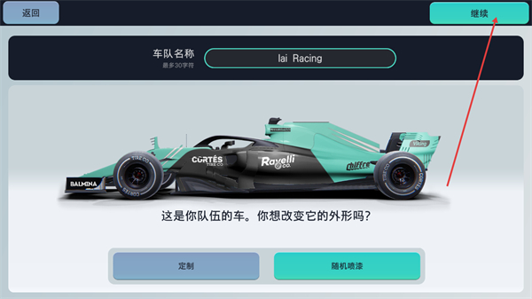 4、进入车队车辆设置界面后,可查看当前车队名称,若需调整车辆外观可点击定制或随机喷漆完成后,点右上角继续推进流程。