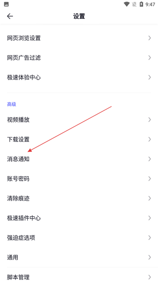 3、在设置页面找到消息通知选项,点击进入消息通知页面。