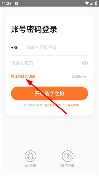 1、打开手迹造字app,在登录页面找到并点击验证码登录/注册。