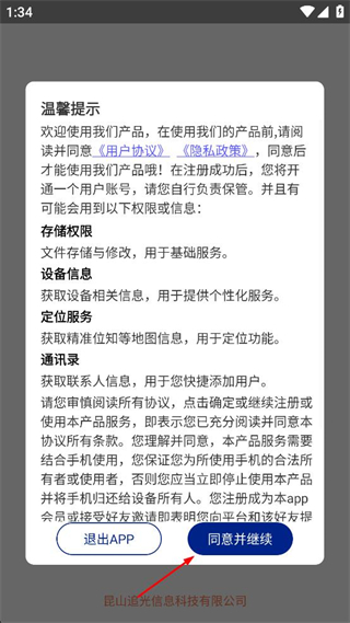 1、阅读产品温馨提示里的用户协议和隐私政策,确认后点击同意并继续按钮,完成前期协议确认环节。
