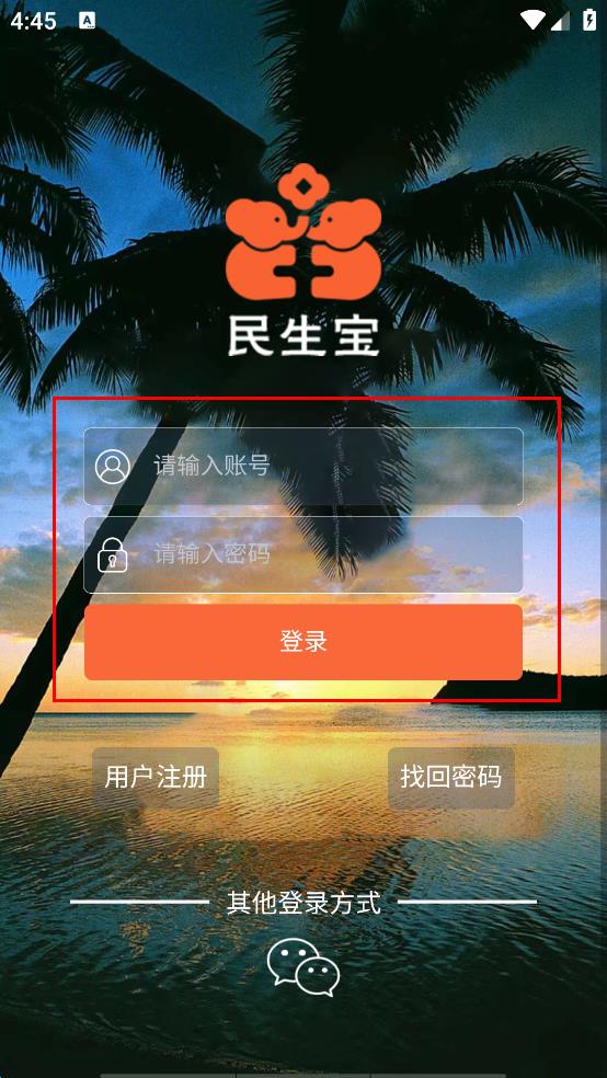 4、在登录页面,首先在对应的输入框中输入账号,然后在密码输入框中输入对应的密码,最后点击登录按钮,即可完成民生宝APP的登录操作。