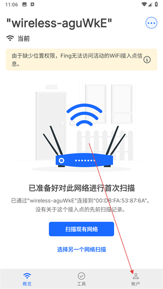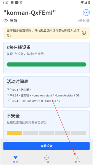 1、打开Fing应用,进入概览页面后点击底部帐户选项,进入帐户页面。