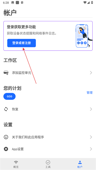 1、打开fing网络扫描仪APP,点击底部导航栏最右侧的帐户选项,进入帐户页面。