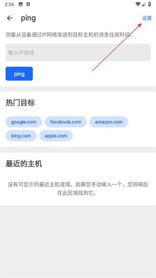 3、在ping页面,点击右上角设置。