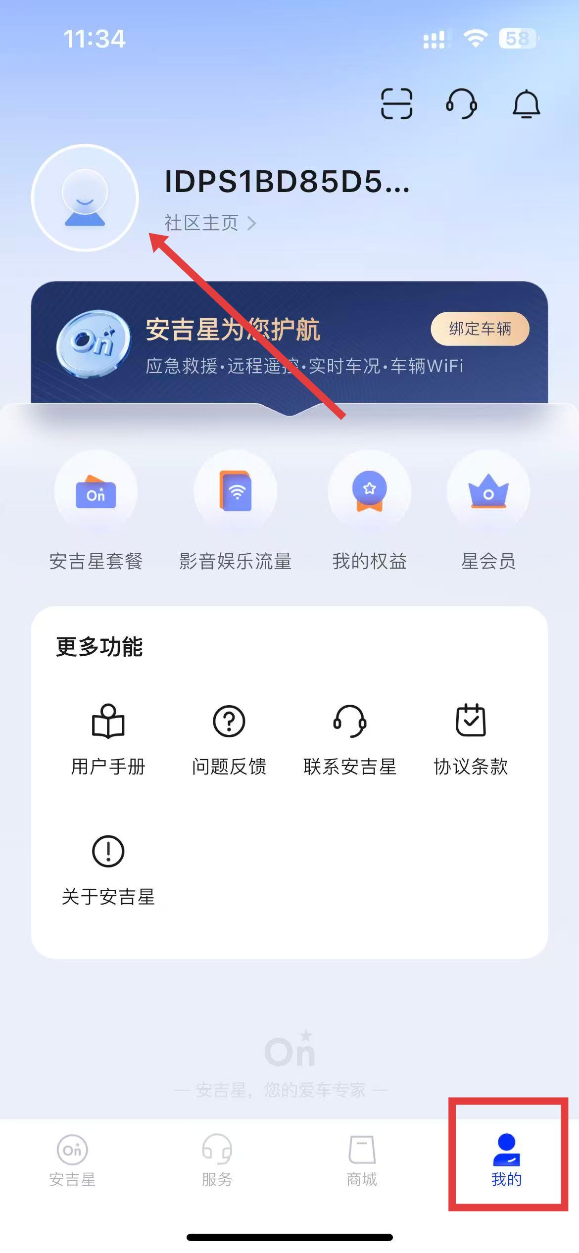 1、打开安吉星APP,点击底部导航栏中的我的,点击头像区域进入个人信息界面。