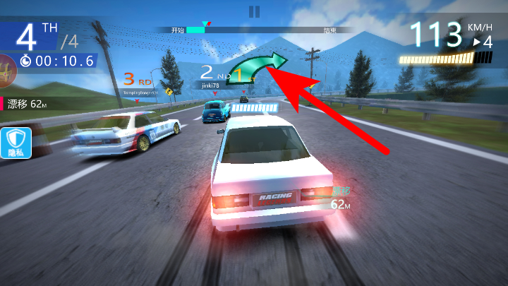 2、在赛道中跟随箭头提示,调整车速追赶前方车辆提升排名。