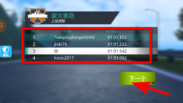 4、赛事结束后查看排名列表,点击下一个进入下一轮比赛。